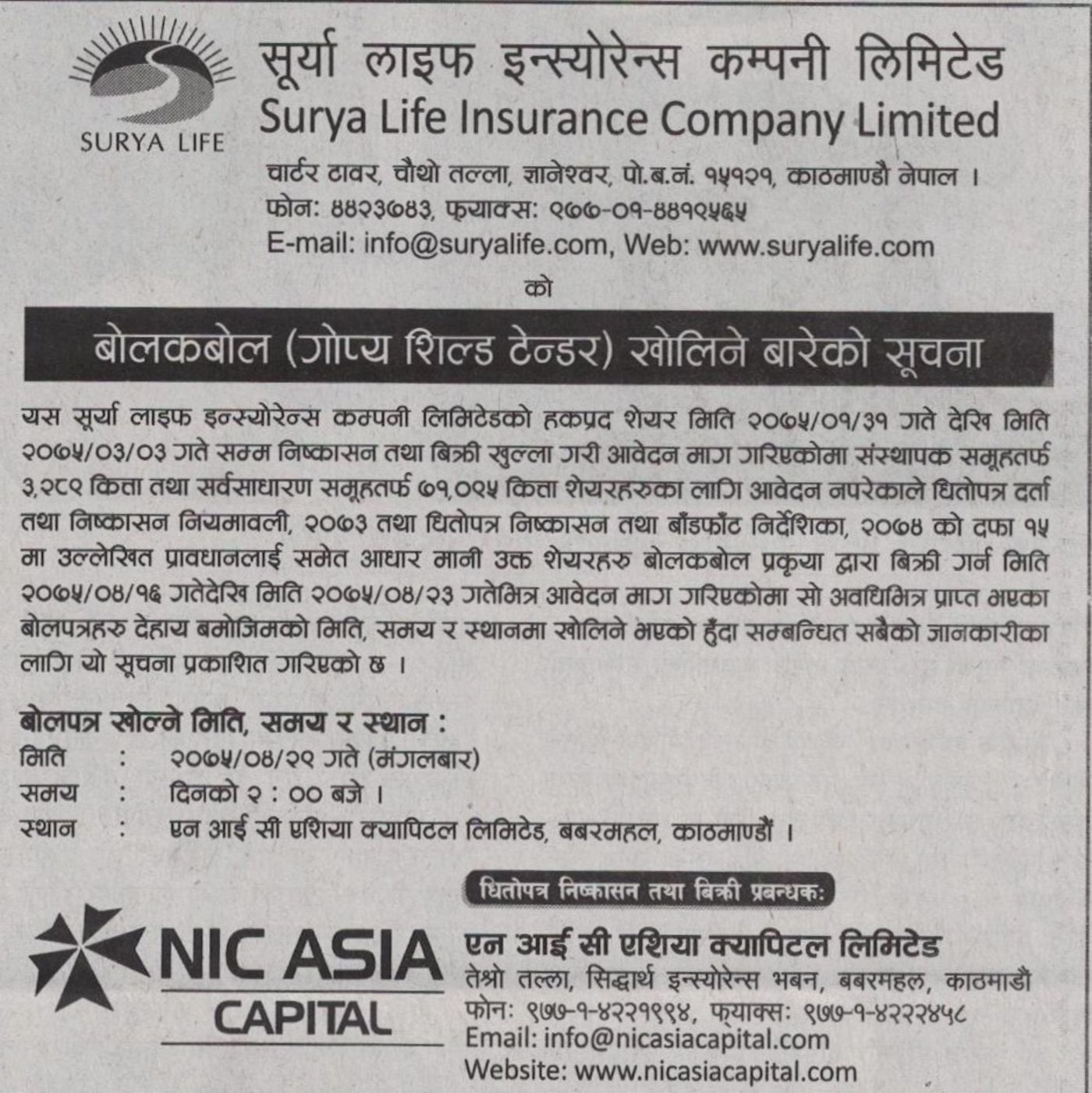 Surya Life Insurance / Financial Notices Nepal Amendment Notice Share Auction Sale Surya Life Insurance Company Ltd Promoter Share